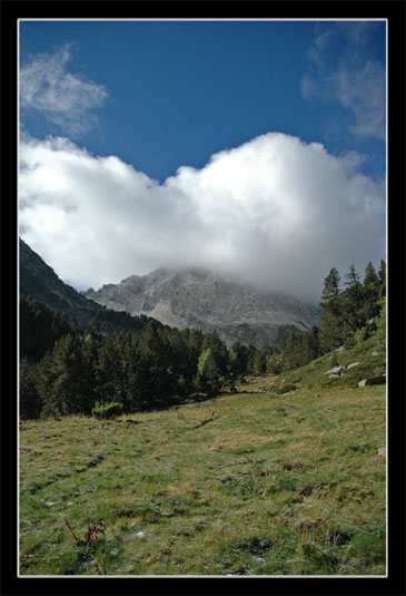 Le Roc Blanc saupoudré d’une fine couche de neige, la tête dans les nuages.