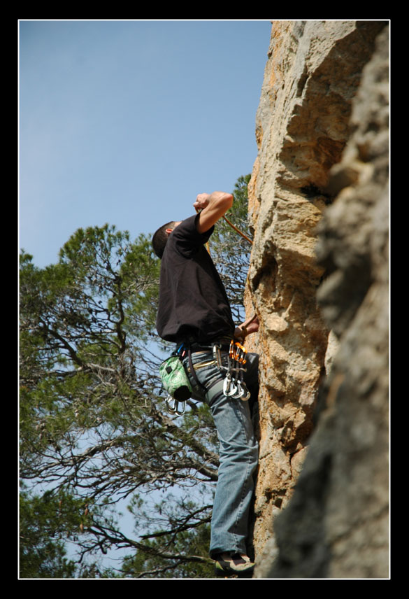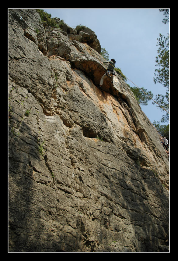 Lorsque nous arrivons au secteur de la Crouzade, le temps est encore maussade et la falaise est passablement humide, mais il en faut plus pour décourager une équipe motivée !