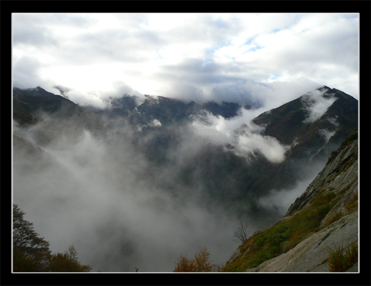 Il nous a bien fallu 1 heure entre escalade, désescalade sur Granit mouillé et progression hasardeuse dans les herbes gorgées d’eau pour rejoindre le col.